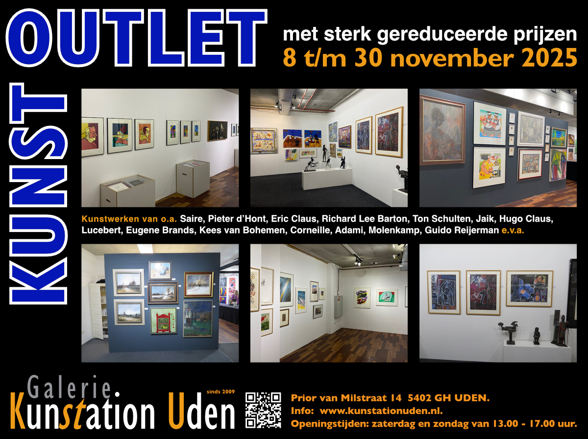 De volgende expositie is een tentoonstelling van veel kunstenaars. Wij hebben dat een Kunst-Outlet genoemd. Daarvoor hebben wij een aantal kunstverzamelaars gevraagd bij ons hun kunstwerken te exposeren. En wij hebben hun gevraagd deze kunstwerken tegen een aantrekkelijke prijs aan te bieden. Vandaar Kunst-Outlet. Er zijn ongeveer 60 werken van verschillende kunstenaars te zien. Schilderijen en beelden.