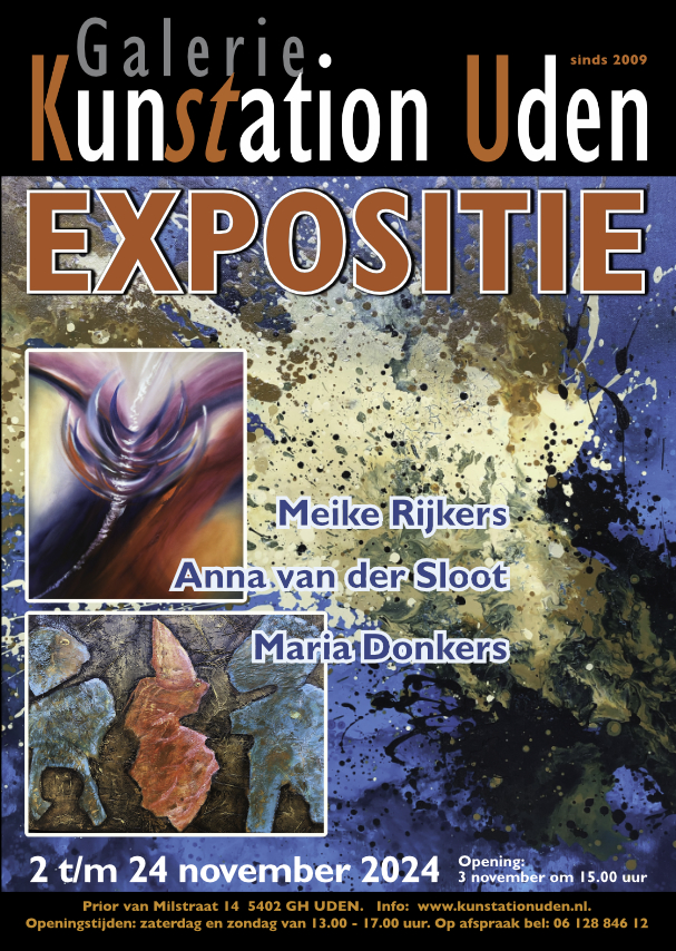De expositie van november met 3 kunstenaars. Met Meike Rijkers, Anna van der Sloot en Maria Donkers. De expositie is van 2 november t/m 24 november 2024.